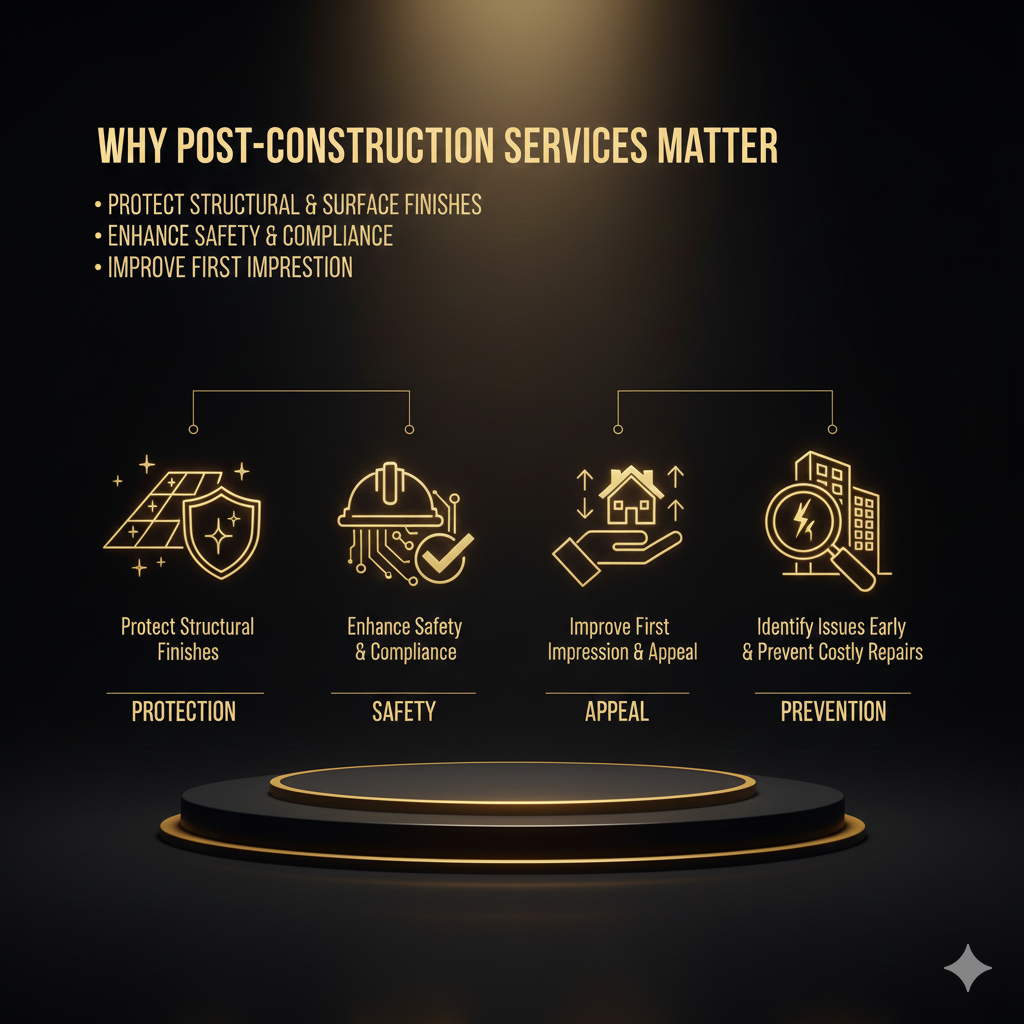 Post construction services play an essential role in protecting and enhancing the long term value of any residential or commercial property. While the primary focus of a construction project is often completion, the work that follows immediately after building is just as important. Proper post construction care ensures that the property is safe, clean and fully prepared for occupancy, ultimately increasing both its market appeal and long term performance.